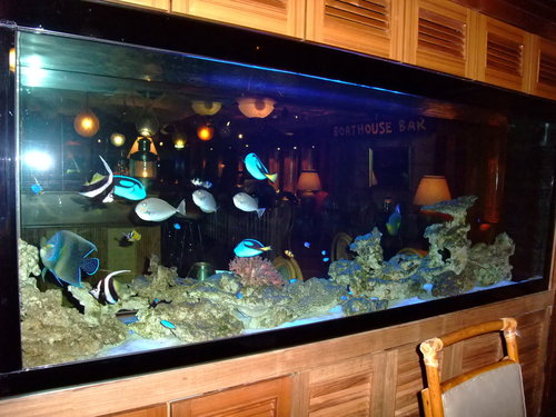 大型的魚缸,貝殼、船舵、漁網等海島風的裝飾,營造出豐富的渡假休閒情調
