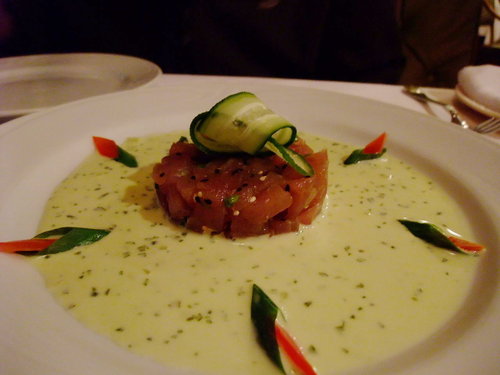 前菜鮪魚塔塔 生魚片品質的鮪魚, 搭配著下面的芥末醬不錯吃