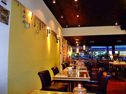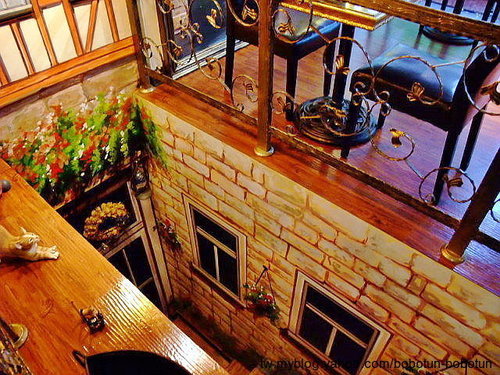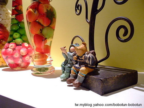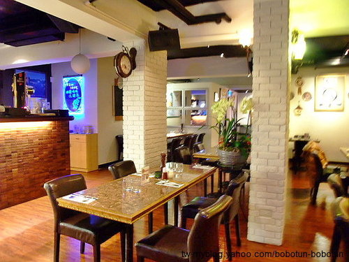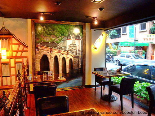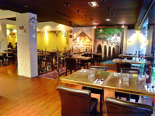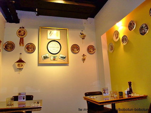 餐廳整體以淡色系為主,氣氛溫馨,牆上掛有圖案瓷盤及可愛的德國娃娃,