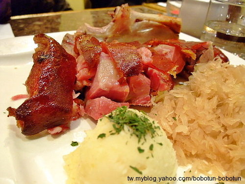 他的招牌的料理--巴伐利亞德國啤酒烤豬腳,附有馬鈴薯泥和酸菜,