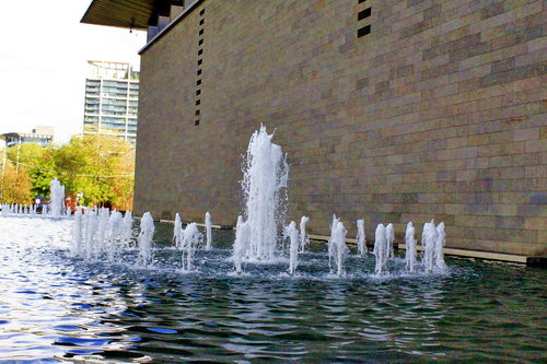 館內外以流動的水瀑玻璃牆為分隔,在炎熱的天氣裡,看了使人立刻消暑