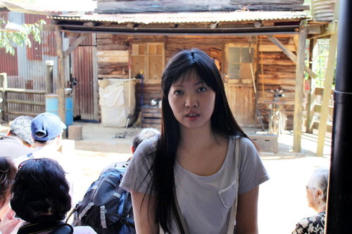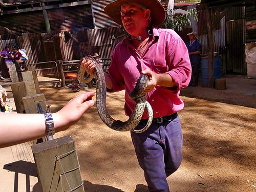 牛仔拿著蟒蛇給現場觀眾摸摸看,蟒蛇身體冰冰涼涼的~~